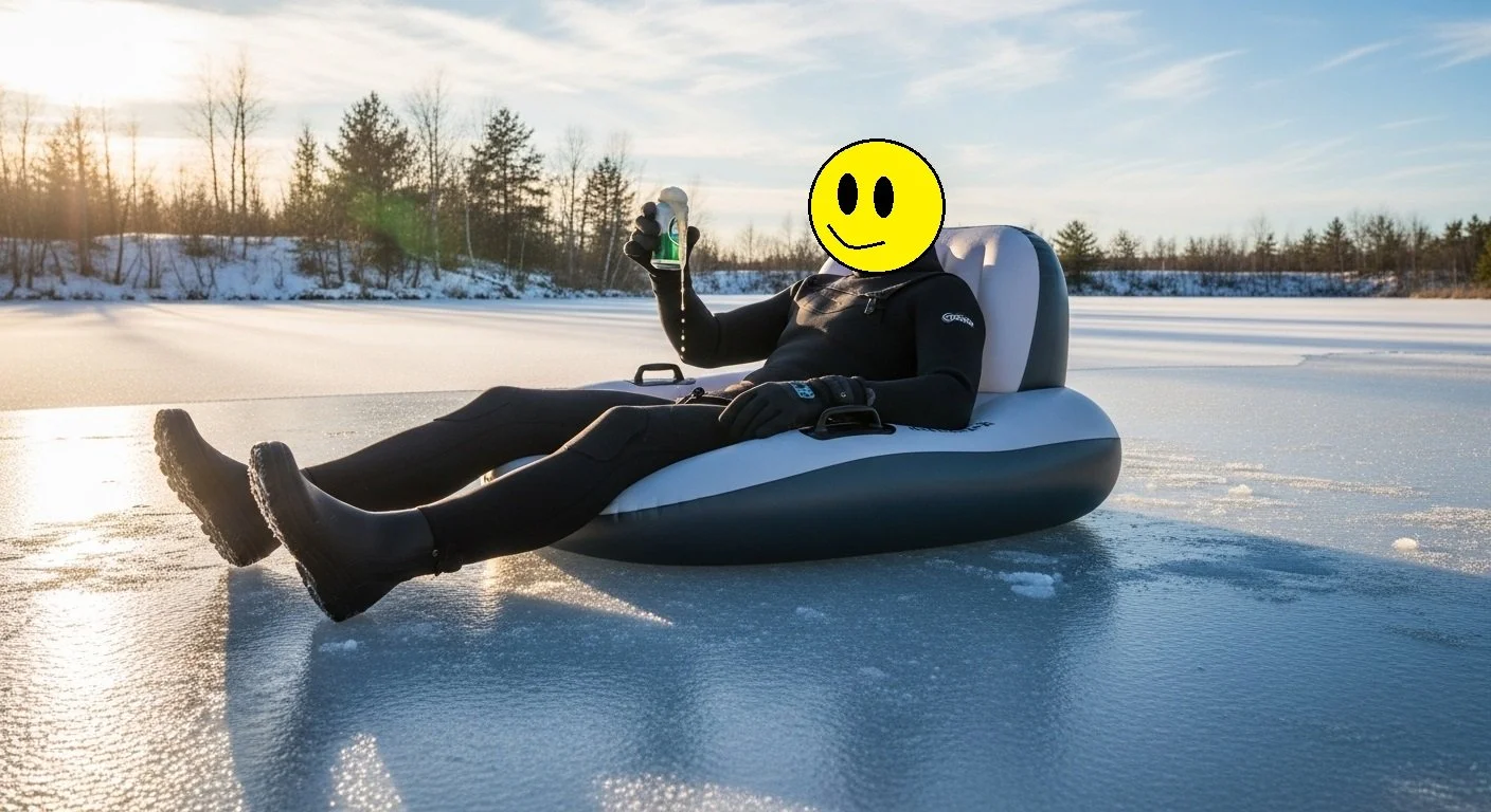 It’s freakin’ freezing out! We had a thunder snow-storm last night and it’s the first week of April. This is madness. In sha’ Allah! Any thoughts of checking out some local waterways for a wetsuit float will require an ice saw to create some open water. That’s not going to happen. However, for the sake of a photo op, I did find a little lake just north of the city which made an excellent setting for a pose with only a short amount of temperature suffering.