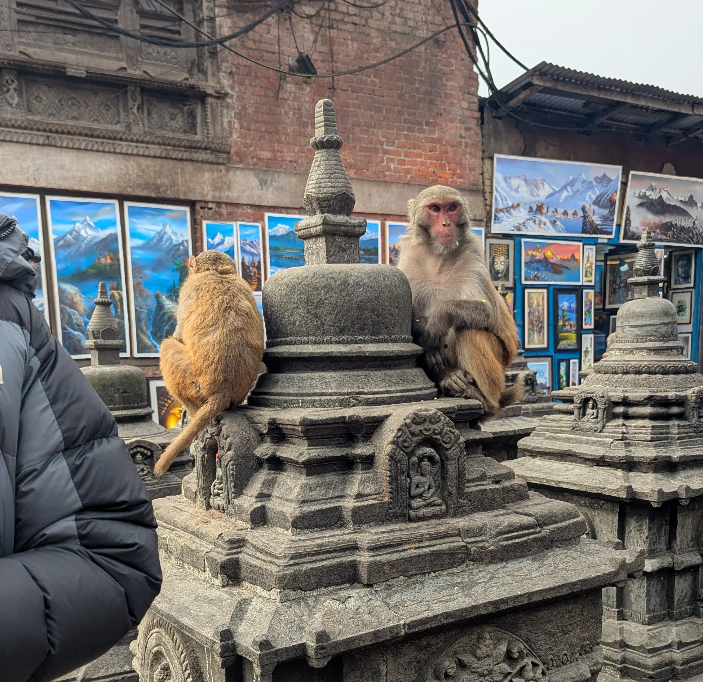 During a guided day trip I visited Swayambhu Mahachaitya which is a hillside complex on the west side of town featuring an iconic Buddhist stupa, various temples and a multitude of shrines. It is also in habited by dozens of Long-tailed Macaques. To some these monkeys are considered sacred as descendants of the Hindu monkey god, Hanuman.