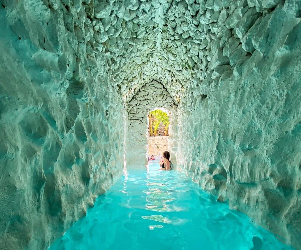 The Grotto is somewhere in between. A family friendly spot with gardens, sunny terraces and many shady sitting areas all served by wait staff from multiple bars and a central kitchen. There are a couple of change areas, bathrooms and lockers to store your dry gear. The main reason to be here are the six different salt water pools (although two seemed to be out of action) with increasing levels of heat. The grotto itself is the final pool which you enter via a tunnel in which you can feel the water getting warmer with every step. It’s a man-made cave, like a large round hot tub inside a rock igloo with the walls and roof made from local boulders and stone all painted white. There are a few small light holes to let in shafts of sunshine illuminating the rising steam and to give the bathers a chance to see where they are. Okay, it’s not a real cave but quaint none-the-less and when you are desperate for a ‘float’ its like a morphine drip.